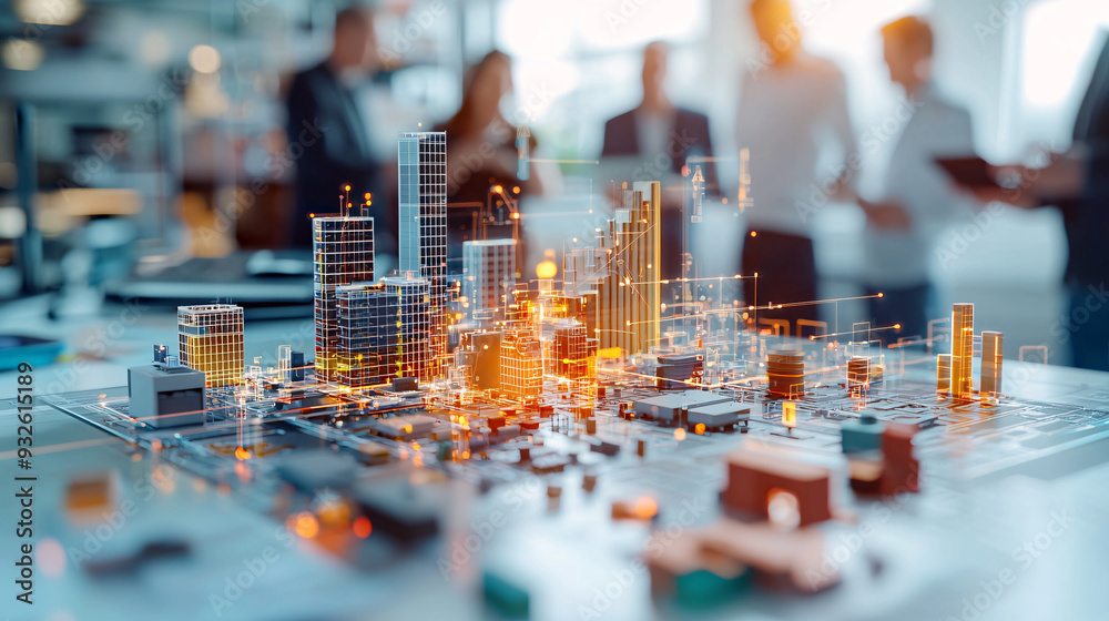 Business professionals planning a digital smart city model with futuristic technology #932615189