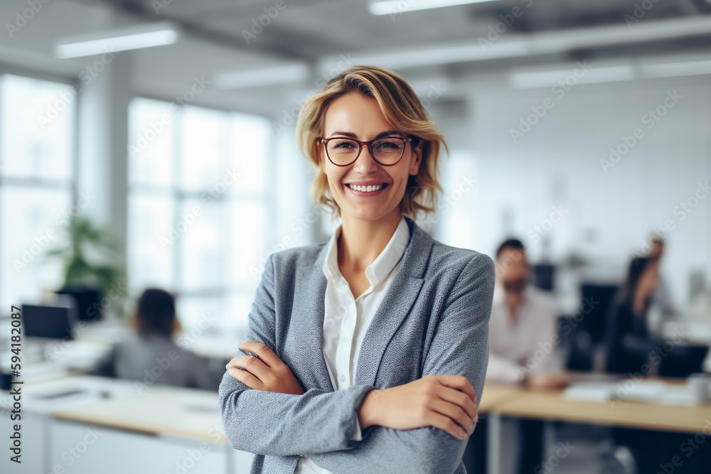 Business woman standing competently and smiling in open plan office - theme woman power, career or manager - Generative AI #594182087