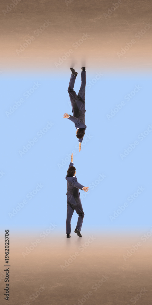 Businessman falling downward while reaching toward another hand in abstract space. Concept of risk failure support rescue, crisis situation and need for help in business environment. #1962023706