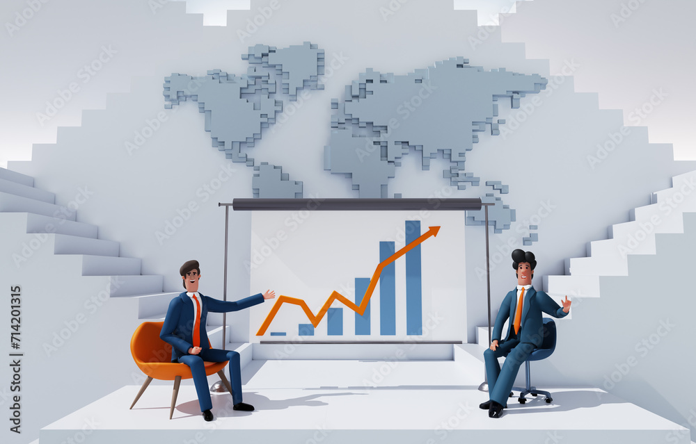Businessman having a presentation, talks about profits. People collaborating on a project, sharing ideas in an abstract business environment. 3D rendering #714201315
