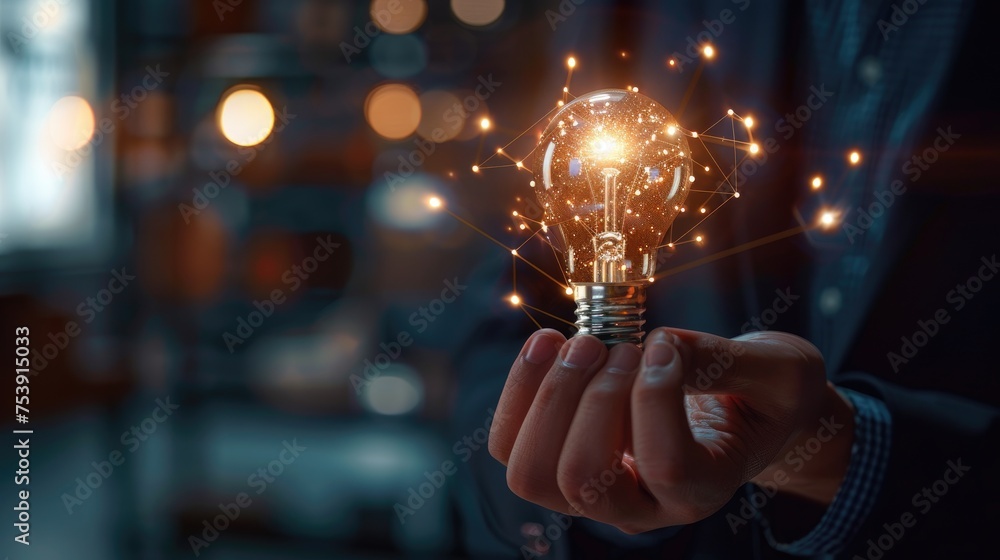 Businessman Holding Creative Light Bulb With Growth Graph And Aerospace Icons. Leveraging Aerospace Innovation Technology To Pioneer New Solutions And Advancements That Elevate Successful #753915033