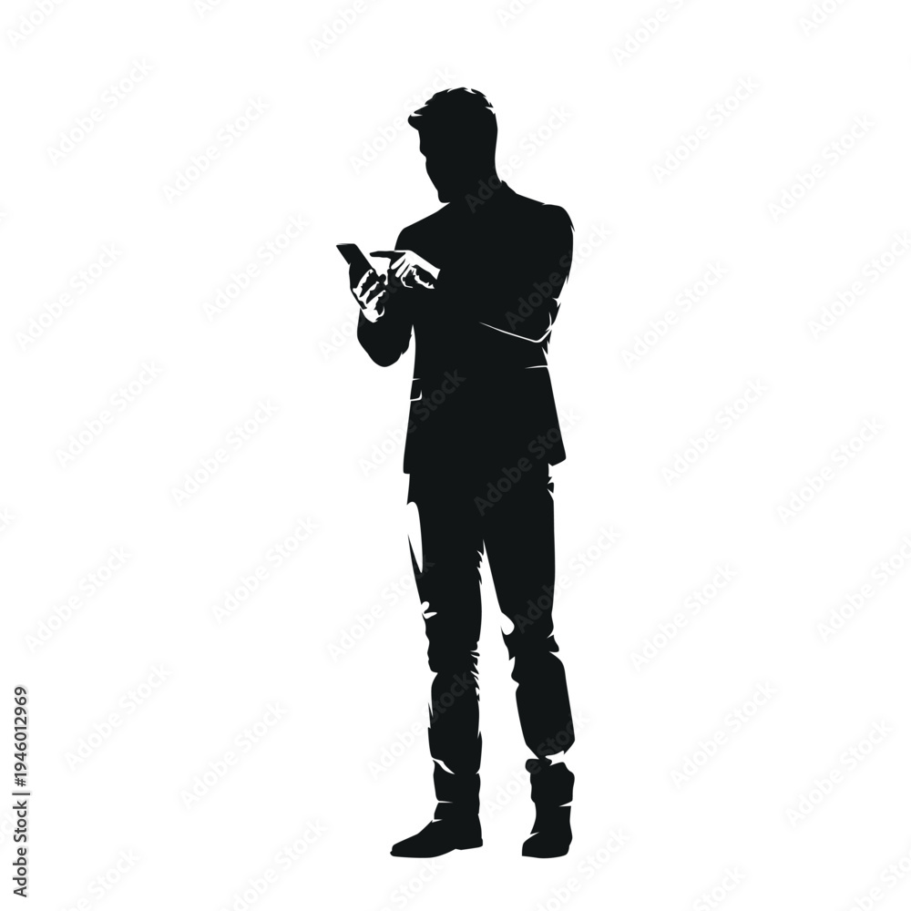 businessman standing and using a smartphone. Full body male figure in a suit interacting with a mobile phone, typing a message or using an app. Modern business and communication concept illustration. #1946012969