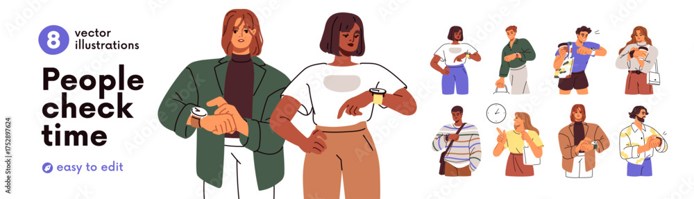 Busy punctual people looking at time on hand watch. Delay, hurry, showing deadline. Men, women checking wristwatch, gesturing with clock on wrist. Flat vector illustration isolated on white background #1752897624