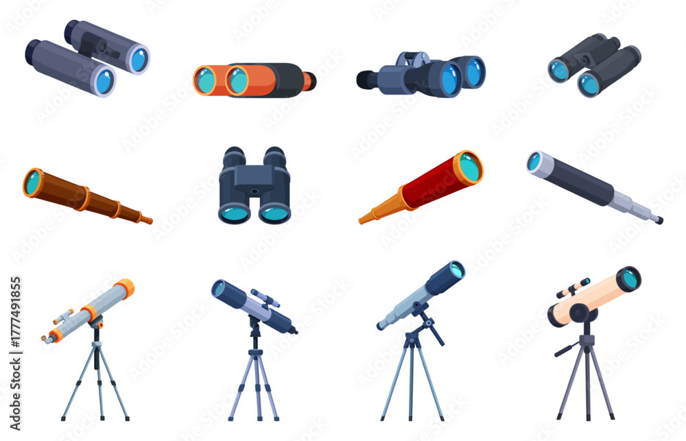 Cartoon optical devices. Binoculars and telescopes, astronomy equipment. Tools for scientific observation of people, birds, surveillance, sapid vector set #1777491855