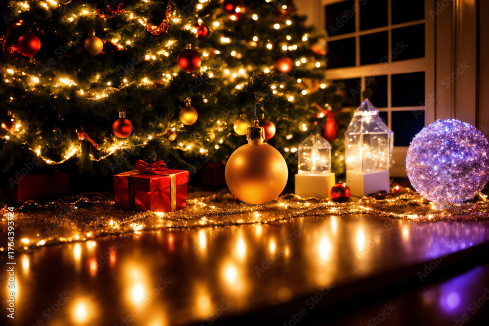 Christmas decorations and lights with a Christmas tree are a beautiful background for the New Year holiday #1764393724