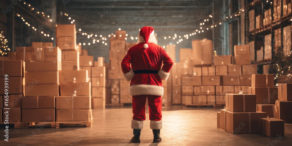 Christmas gift delivery Santa Claus standing in shop warehouse storage full of cardboard present boxes concept of logistic e-commerce e-business holiday package goods shipping service #1654939199
