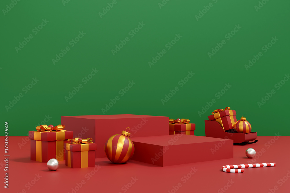 Christmas Gifts and Decorations on Red Stage with Green Background #1730532949