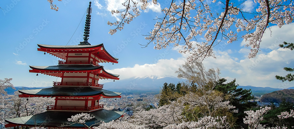 Chureito red Pagoda with beautiful Cherry Blossom or pink Sakura flower tree and Mount Fuji against blue sky. Spring Season at Fujiyoshida, Japan. landmark and popular for tourist attractions #244858261