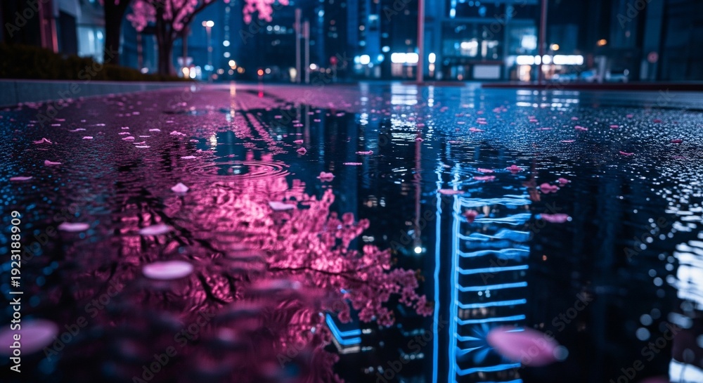 Cityscape reflected in water at night with cherry blossoms and blue light #1923188909