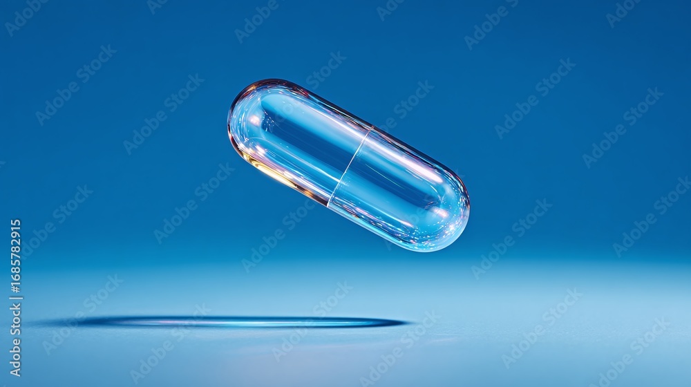 Clear Capsule: A transparent medical capsule floats against a blue backdrop, casting a soft shadow. Health, wellness, and pharmaceutical concepts visualized. #1685782915