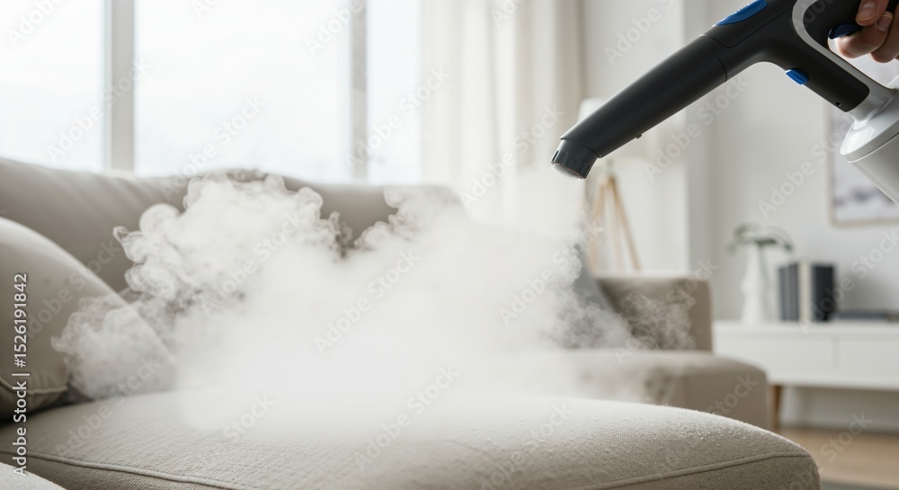 Close up of a person using a handheld steam cleaner to sanitize and refresh a fabric sofa in a modern living room. Deep cleaning upholstery for a hygienic home environment. #1526191842