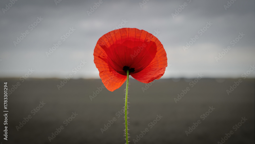 Close Up of a Single Red Poppy Flower with a Blurred Desaturated Background for Remembrance Day #1783301294