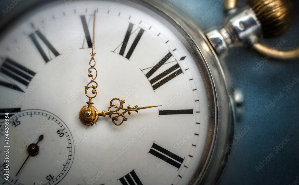 Close up old antique classic clock. Concept of time, history, science, memory, information. Retro style. Vintage watch, clock background. #1744316334