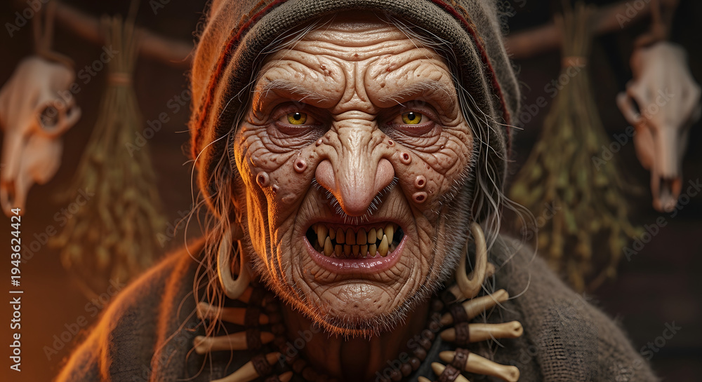 Close-up portrait of a terrifying ancient witch with sharp teeth, glowing yellow eyes, and bone necklace in a dark rustic cabin. #1943624424