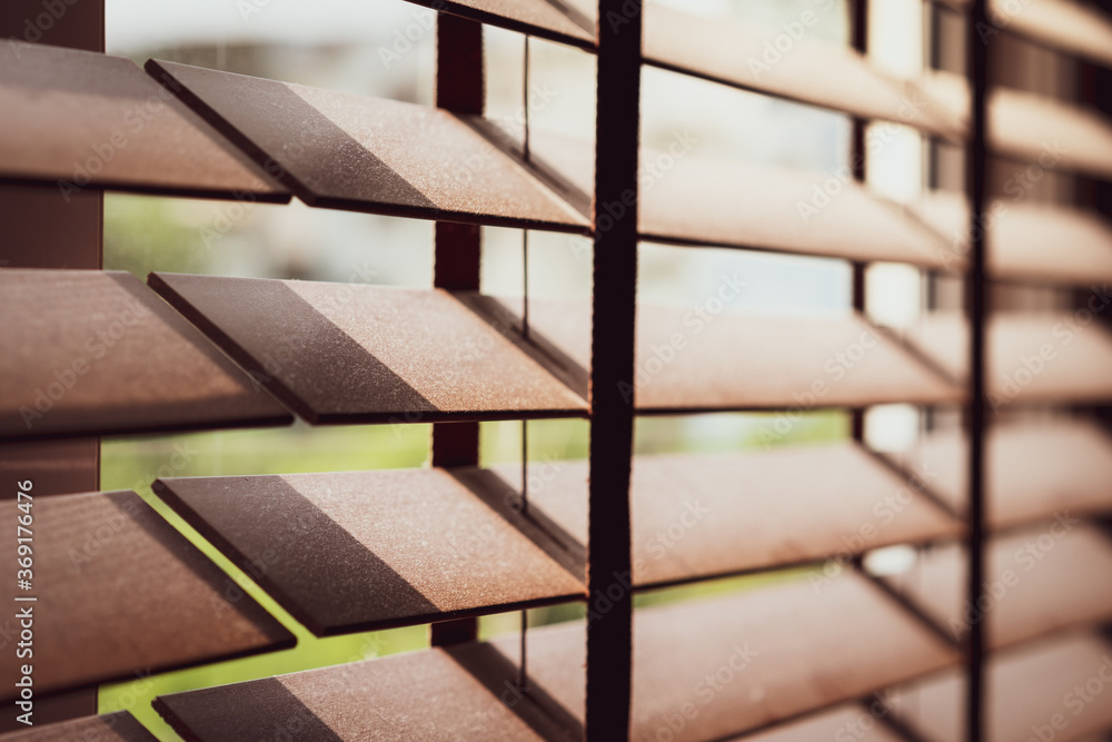 Closeup of a wooden window venetian blinds in the bedroom full of tiny pieces of particle dust which come from the power plants, factories, construction sites. It can cause allergies. Air pollution. #369176476