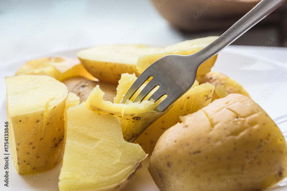 Closeup of fork ready to use for eating yummy boiled in skin potatoes. Fork piercing boiled potato on plate, home-cooked food concept #1754133846