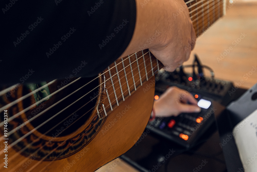 Closeup photo of male guitarist recording and playing guitar Close-up of ten-string nylon guitar played by professional musician #1974612374