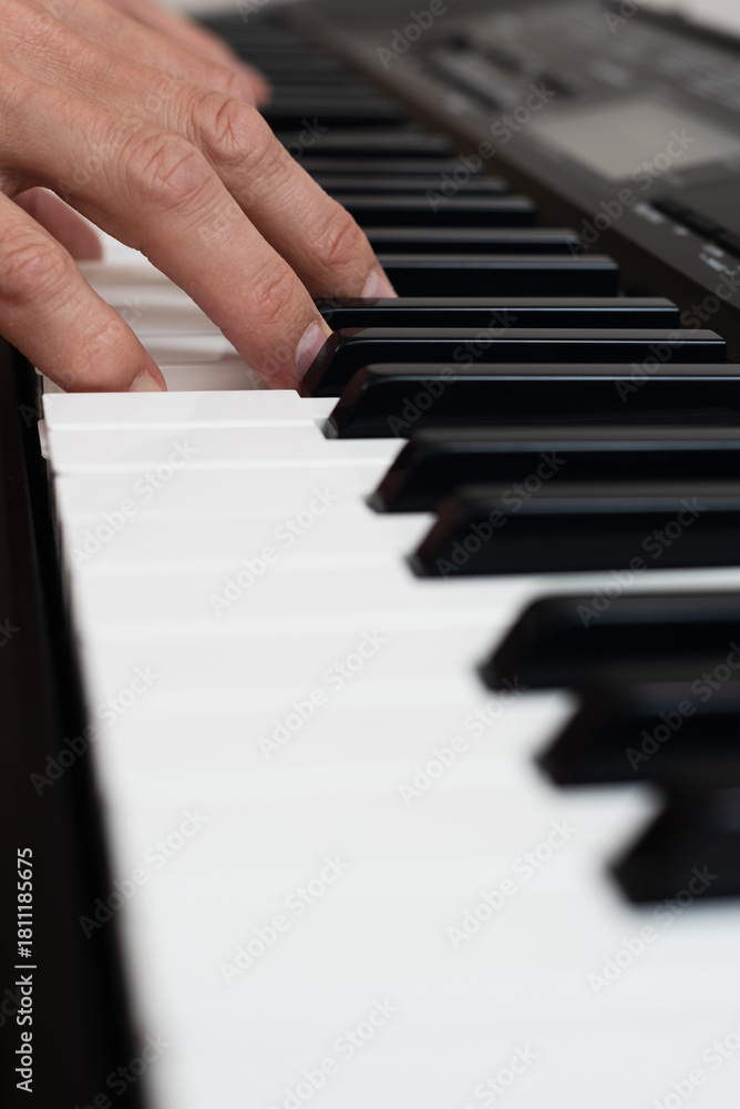 Closeup photo of male hands playing on electronic keyboard. Close-up of hand playing piano keys during casual home music practice. #1811185675