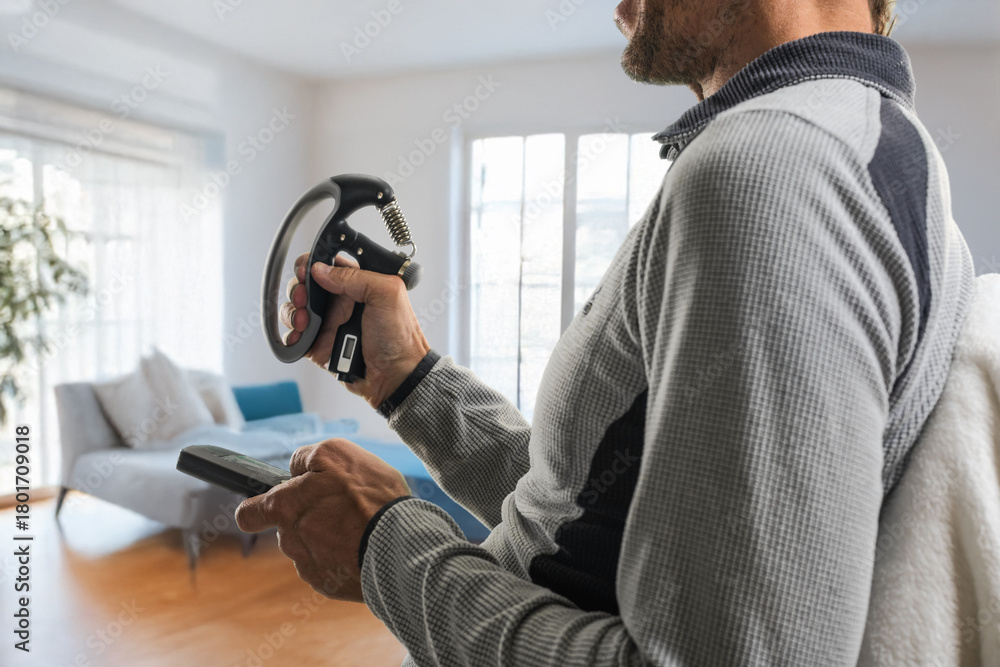 Closeup photo of man doing exercises for wrist illness prevention while watching TV. Man watching TV while exercising hand with grip strengthener at home #1801709018