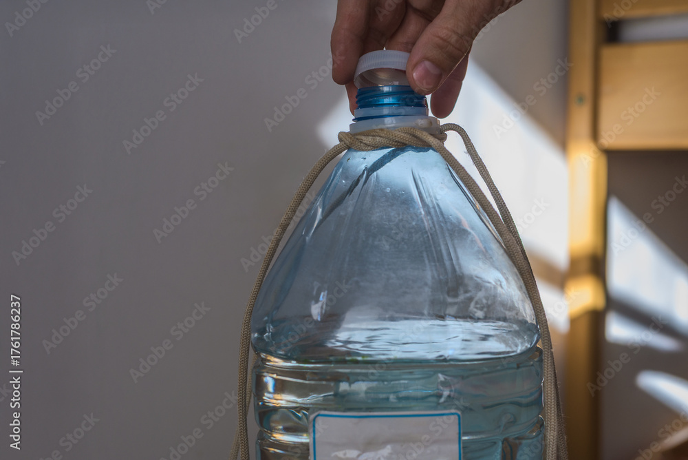 Closeup photo of man holding big plastic bottle with pure drinking water. Plastic water bottle with DIY rope handle, hand holding the neck of the bottle #1761786237