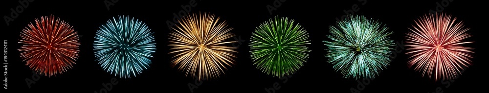 Collection of colorful fireworks bursts isolated on black background. Festive celebration elements representing holidays, festivals, New Year events and party decorations. #1943124111