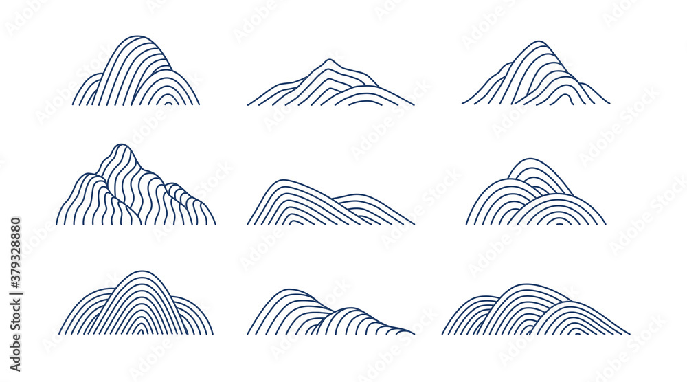 Collection of mountain shapes icons isolated on white background. Line art design. Vector flat illustration. #379328880
