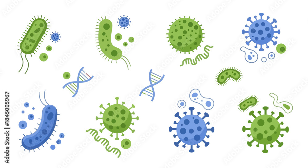 Collection of various virus and bacteria with dna strain illustration over white background #1845005967