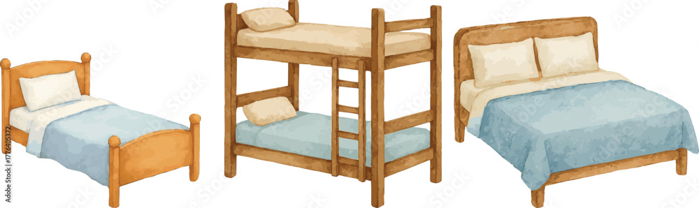 Collection of vector watercolor painted single bed, double bed and bunk bed #1776405372