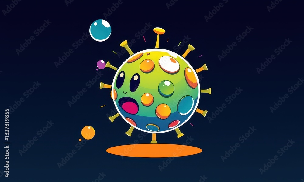 Colorful Cartoon Style Virus Illustration with Smiling Expression and Multicolored Spherical Bubbles on a Dark Blue Background #1327819855