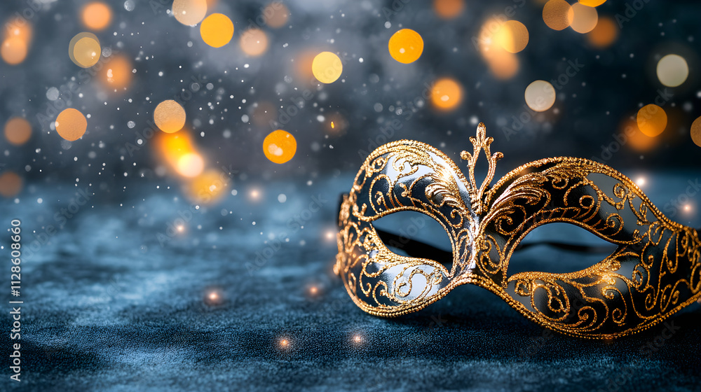 Colorful venetian mask golden glitter on black bokeh background. Mardi Gras, Purim traditional masquerade party concept. Mystery carnival backdrop for design card, banner, flyer with copy space #1128608660