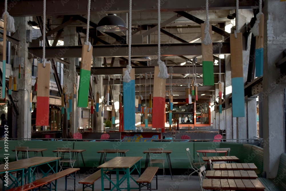 Colorful wooden ornaments hanging at a food court #317109247