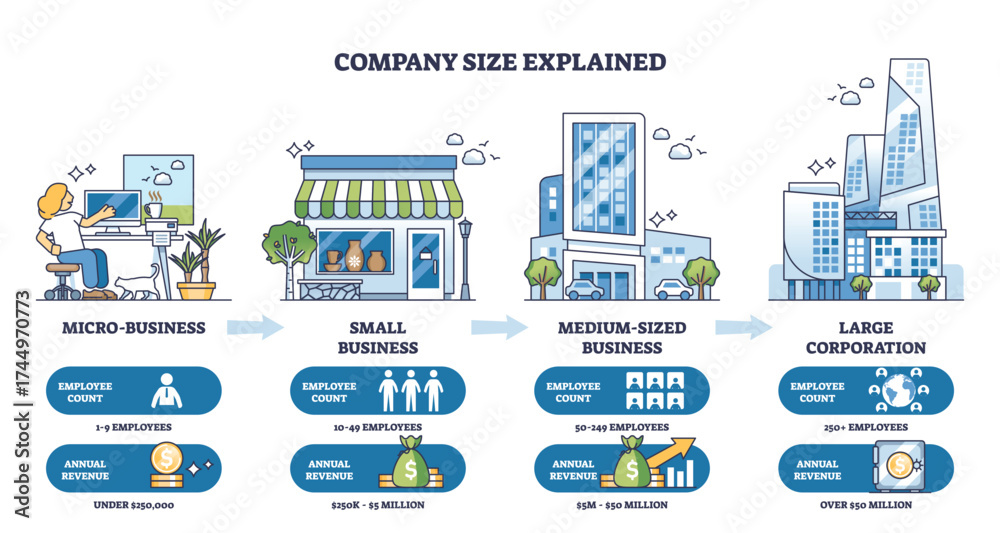 Company size brief diagram shows growth from micro business to large corporation, mapping employee counts and revenue with arrows, key objects, buildings, icons, arrows. Outline diagram #1744970773