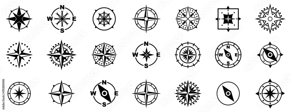 Compass symbols collection. Navigation stars with directional marks and circular shapes. Travel and orientation icons for map and exploration design #1958814416