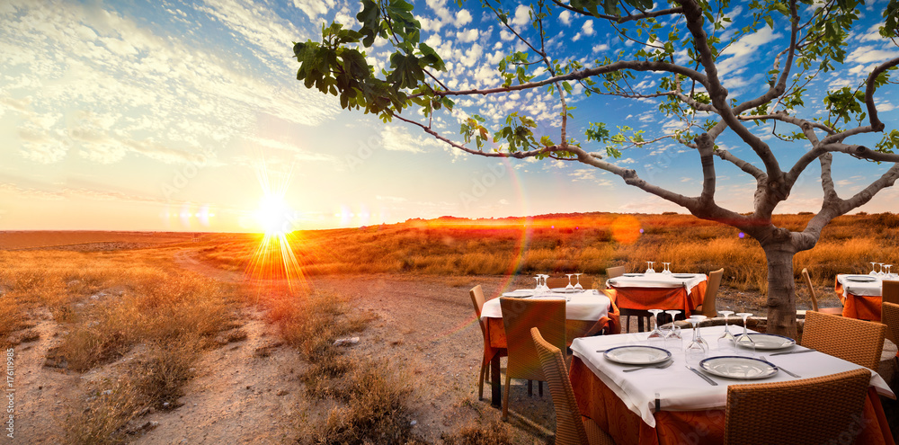 Concepto de gourmet y comer en el restaurante. Paisaje surrealista de puesta de sol con mesa y platos en la naturaleza romántica e idílica. #176119985