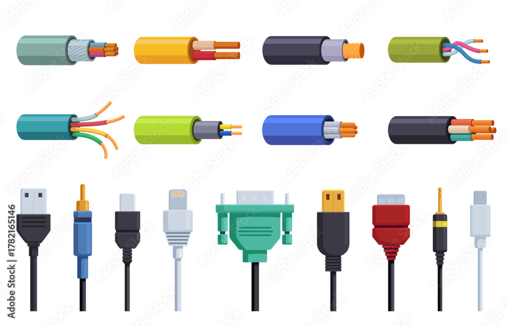 Connectors and cables. Electrical conductors, electric industrial elements with insulation. Energy and power for digital devices, sapid vector set #1782165146