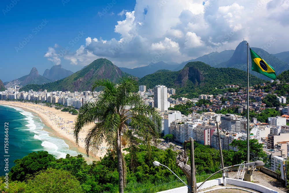 Copacabana beach in Rio de Janeiro, Brazil. Copacabana beach is the most famous beach of Rio de Janeiro, Brazil. Skyline of Rio de Janeiro with flag of Brazil #1755864672