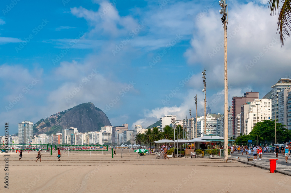 Copacabana beach with kiosk and mosaic of sidewalk in Rio de Janeiro, Brazil. Copacabana beach is the most famous beach in Rio de Janeiro. Sunny cityscape of Rio de Janeiro #1943027516