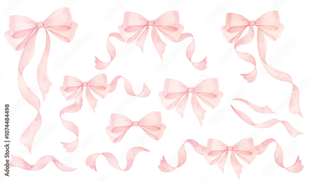 Coquette pink ribbon bow watercolor set isolated on white background. A delicate and charming hand drawn vector illustration. Perfect for greeting cards, printing and other design projects. #1074484498