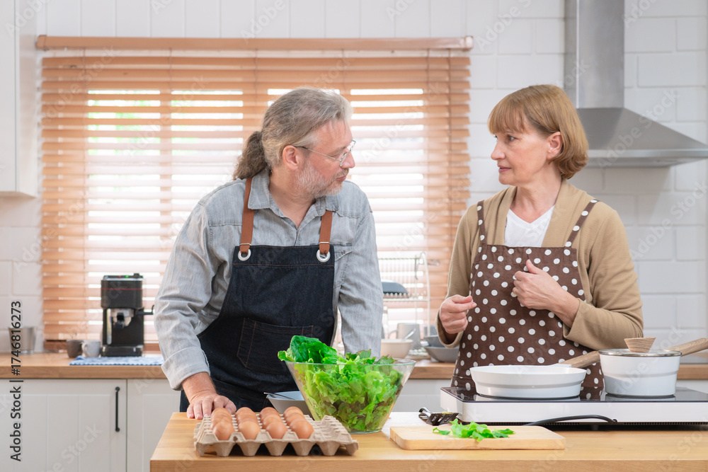 Couple senior elder happy living in home kitchen. Grandmother cooking with grandfather with happiness and smile enjoy retirement life together. Older people relationship and activity. #1746816273