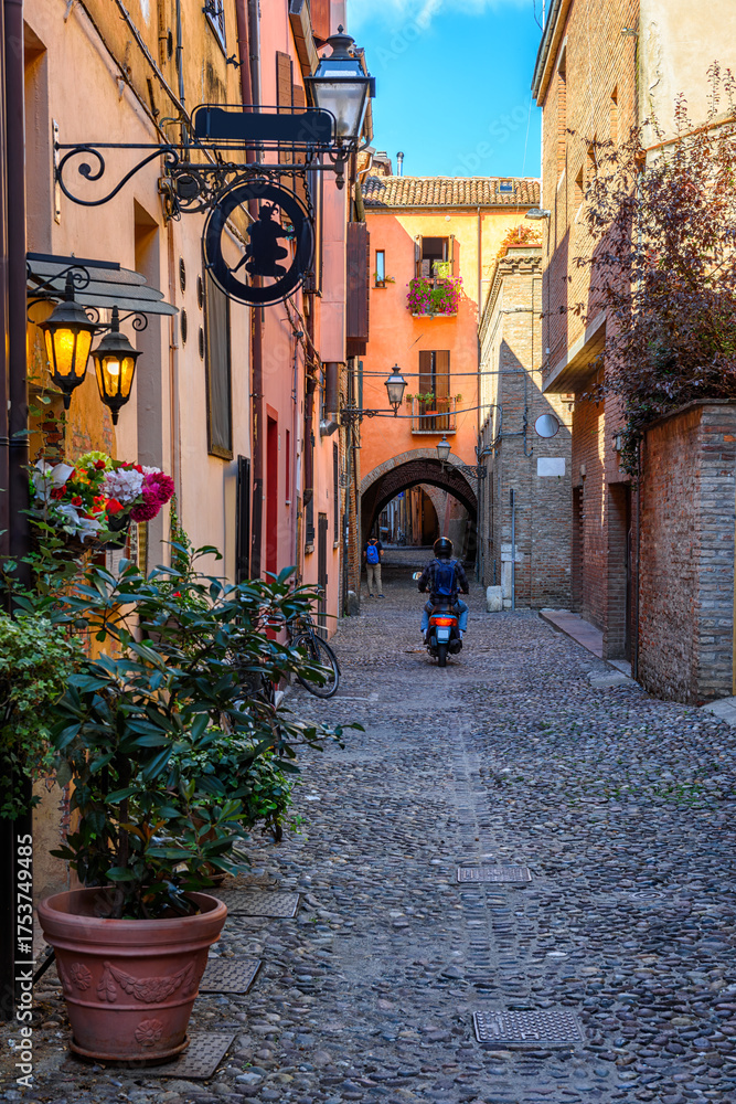 Cozy narrow street in Ferrara, Emilia-Romagna, Italy. Ferrara is capital of the Province of Ferrara #1753749485