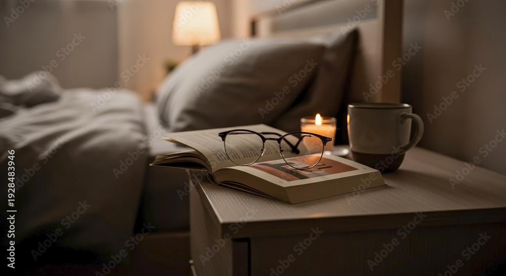 Cozy Nightstand with Open Book, Reading Glasses, Candle and Mug for Bedtime Rituals, Relaxation Blogs, Mindfulness Content, and Home Decor Websites #1928483946