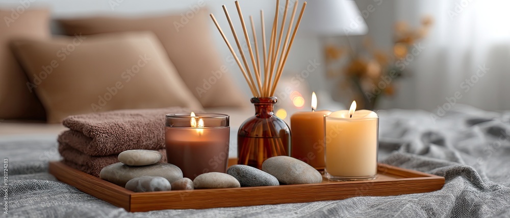 Cozy setup shows scented candles, reed diffusers, and decorative rocks on a wooden tray in a living room designed for winter relaxation #1920724283