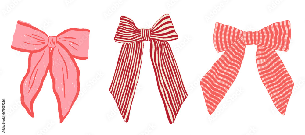Crayon bows set. Coquette style ribbons and bows striped and plaid, aesthetic vintage elegant cliparts. Hand drawn pencil art decor, bowknots for girly, birthday, gift, wedding. Vector illustration #1679059256