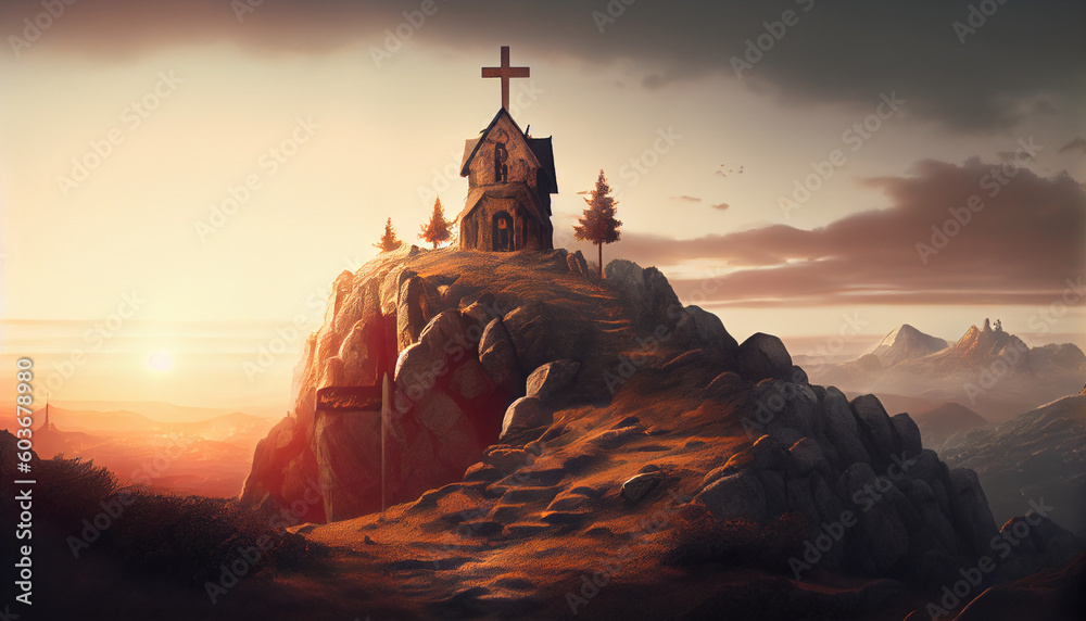 Cross, a chapel on top of a mountain in the rays of the setting sun. AI generative. #603678980