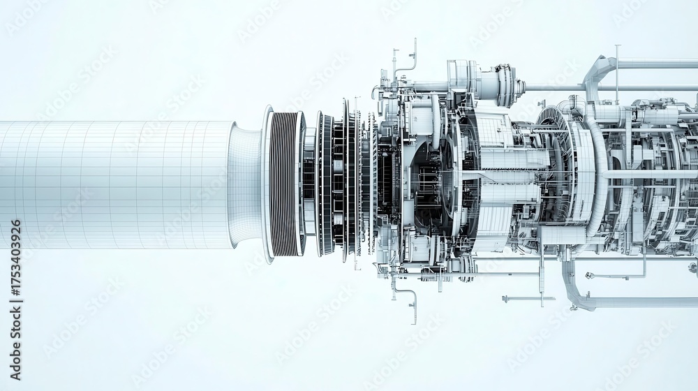 Crosssectional technical drawing of a thermal power plant s steam turbine, showing rotor blades, casings, and exhaust outlets #1753403926