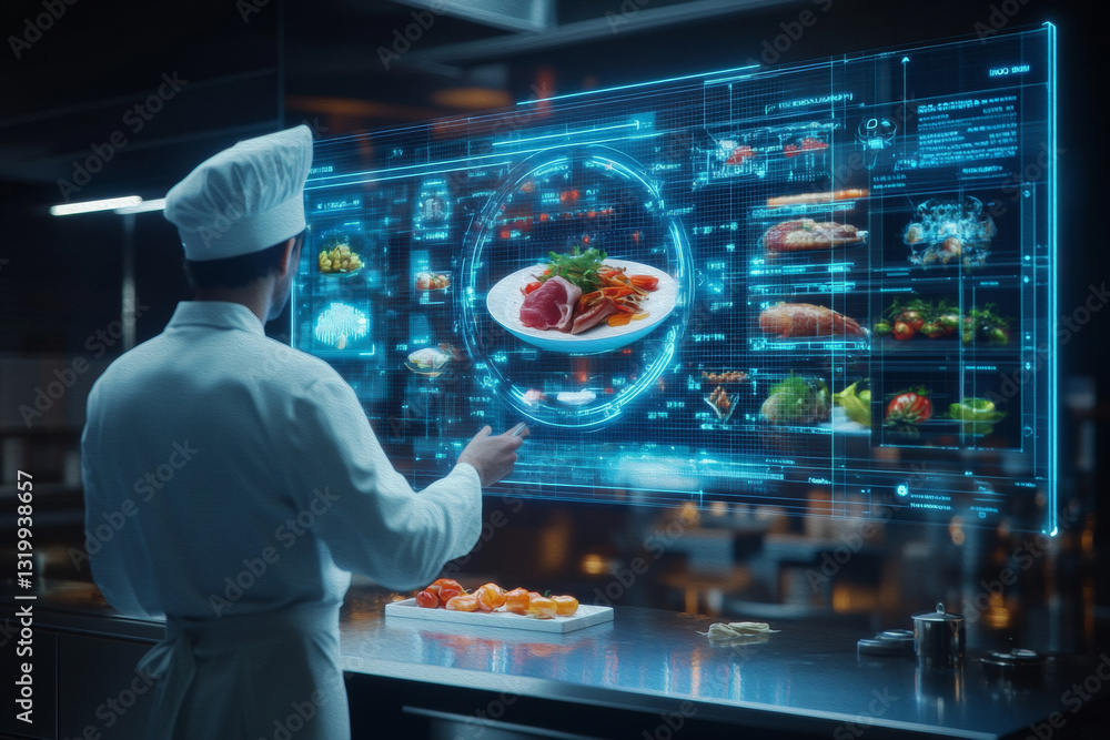 Culinary Visionary: A chef, immersed in a futuristic kitchen, interacts with a holographic display showcasing a gourmet dish, blending technology and gastronomy #1319938657