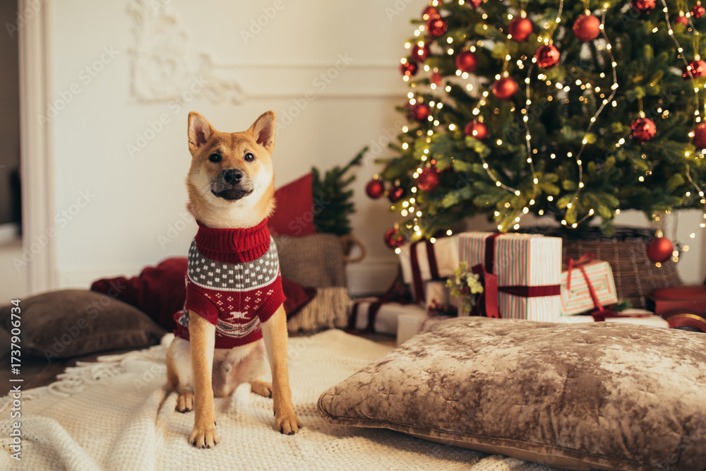 Cute dog wearing knitted sweater sitting under Christmas tree in a decorated living room. #1737906734