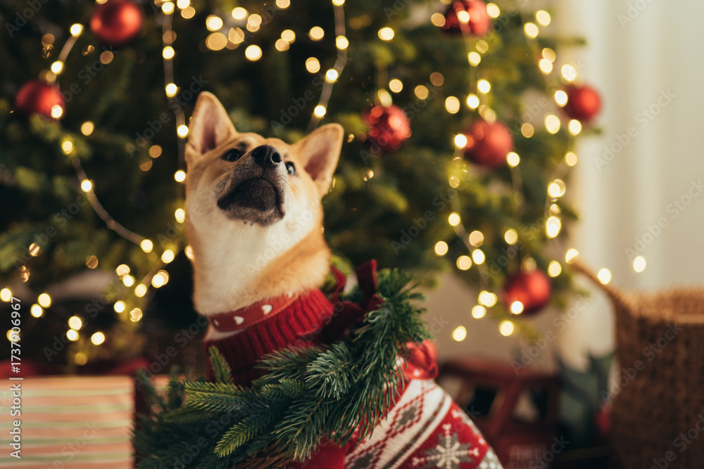 Cute dog wearing knitted sweater sitting under Christmas tree in a decorated living room. #1737906967