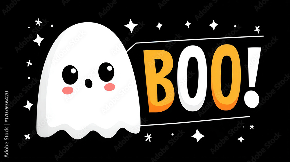 Cute ghost with a speech bubble saying boo on a black background #1707936420