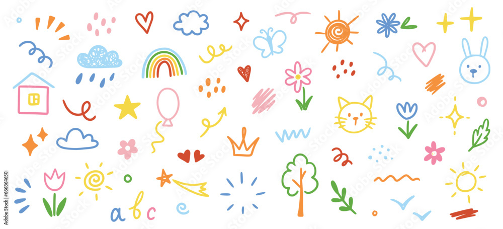 Cute kid scribble line flower, heart. rainbow background. Hand drawn doodle sketch childish element set. Flower, heart, cloud children draw style design elements background. Vector illustration #666864650